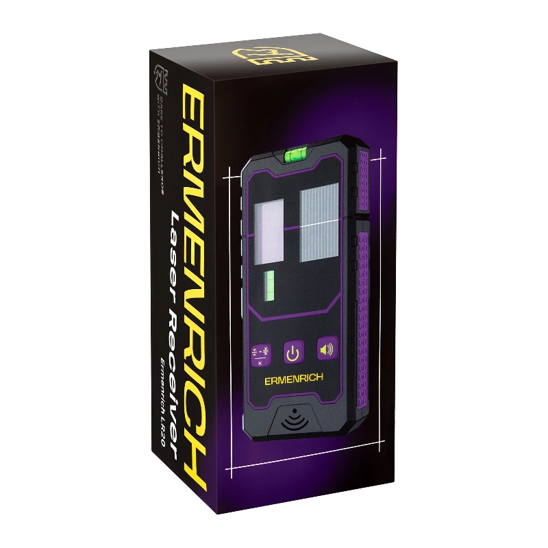 Ermenrich LR20 - это лазерный приёмник, который помогает лучше работать с лазерными уровнями. Особенно когда нужно измерять большие расстояния, работать при ярком свете. лазерный приёмник хорошо определяет зелёные и красные лучи на расстоянии до 50 метров, а также поддерживает два режима точности: точный (прибл. 2 мм погрешности) и обычный (прибл. 3 мм). Когда прибор ловит луч, то сразу сигнализирует об этом, с помощью индикаторов и зуммера. Громкость зуммера можно настроить, а также выключить совсем, если необходима тишина.